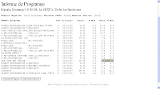 Hay quien pensará que hacer un 6,2 no es demasiado, pero si se piensa que la media de la cadena en septimebre fue del 6, resultará que el programa se encuentra en su sitio. La Sexta tuvo el domingo un resultado total del 7,1, por encima de lo normal: era de esperar, pues tenía fútbol e hizo momentos de más de veinte. Los domingos anteriores de octubre, La Sexta ha estado por debajo del 6 en el conjunto del día.
